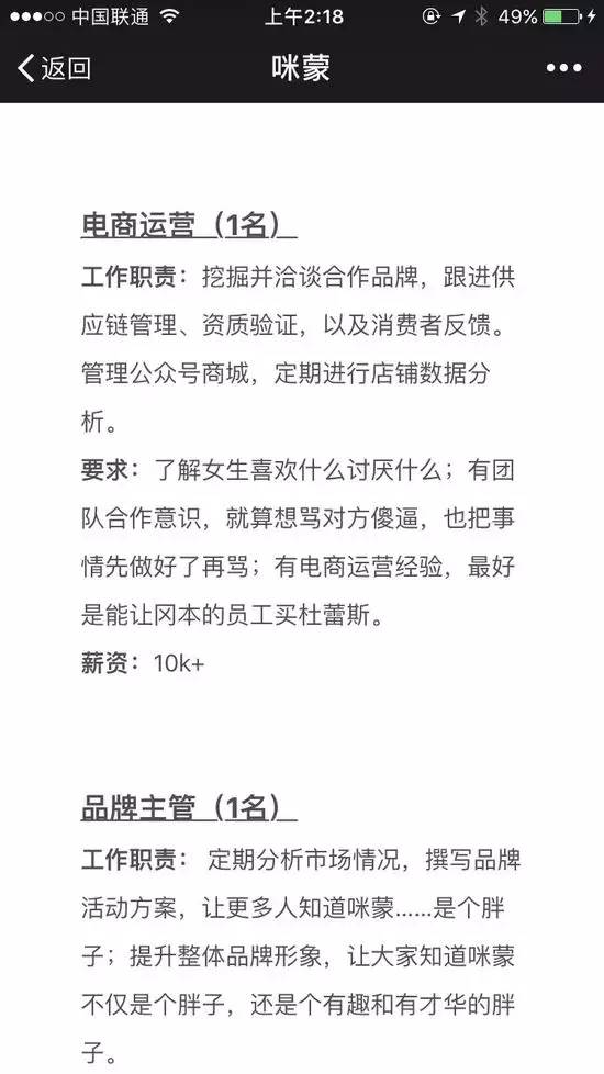 上周六晚,回歸第四天的(de)咪蒙按慣常在将近晚上十二點的(de)時(shí)候發布了(le)。被禁言了(le)一個(gè)月(yuè)的(de)咪蒙沒有韬光(guāng)養晦的(de)意思,反而展開了(le)新一輪緊鑼密鼓的(de)招聘,其中一個(gè)職位是電商運營。